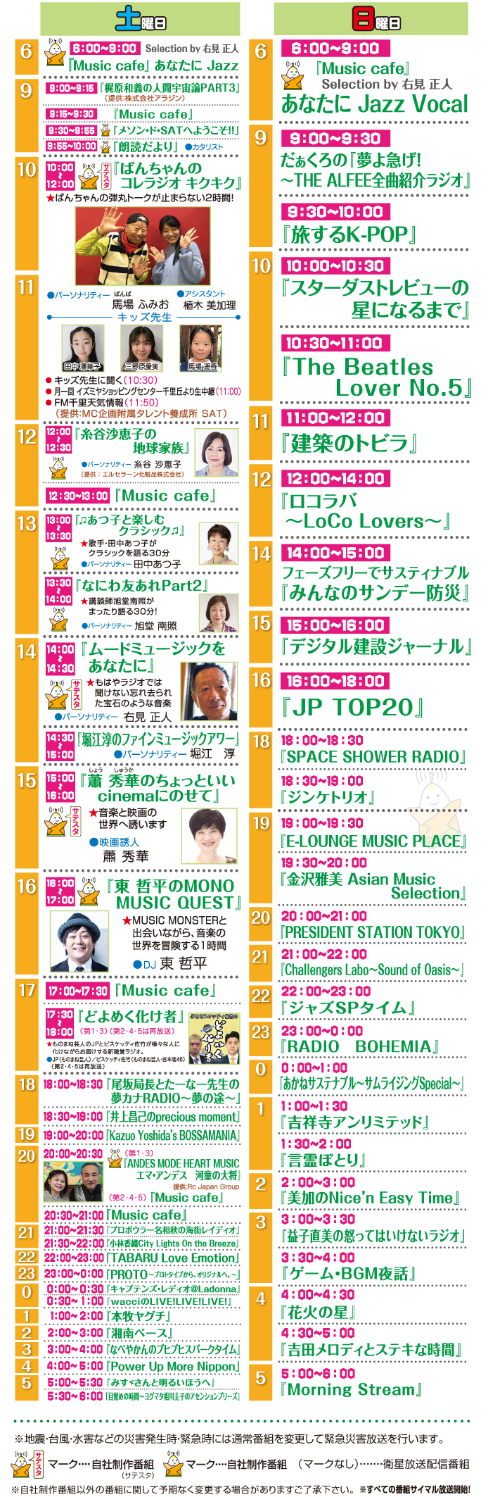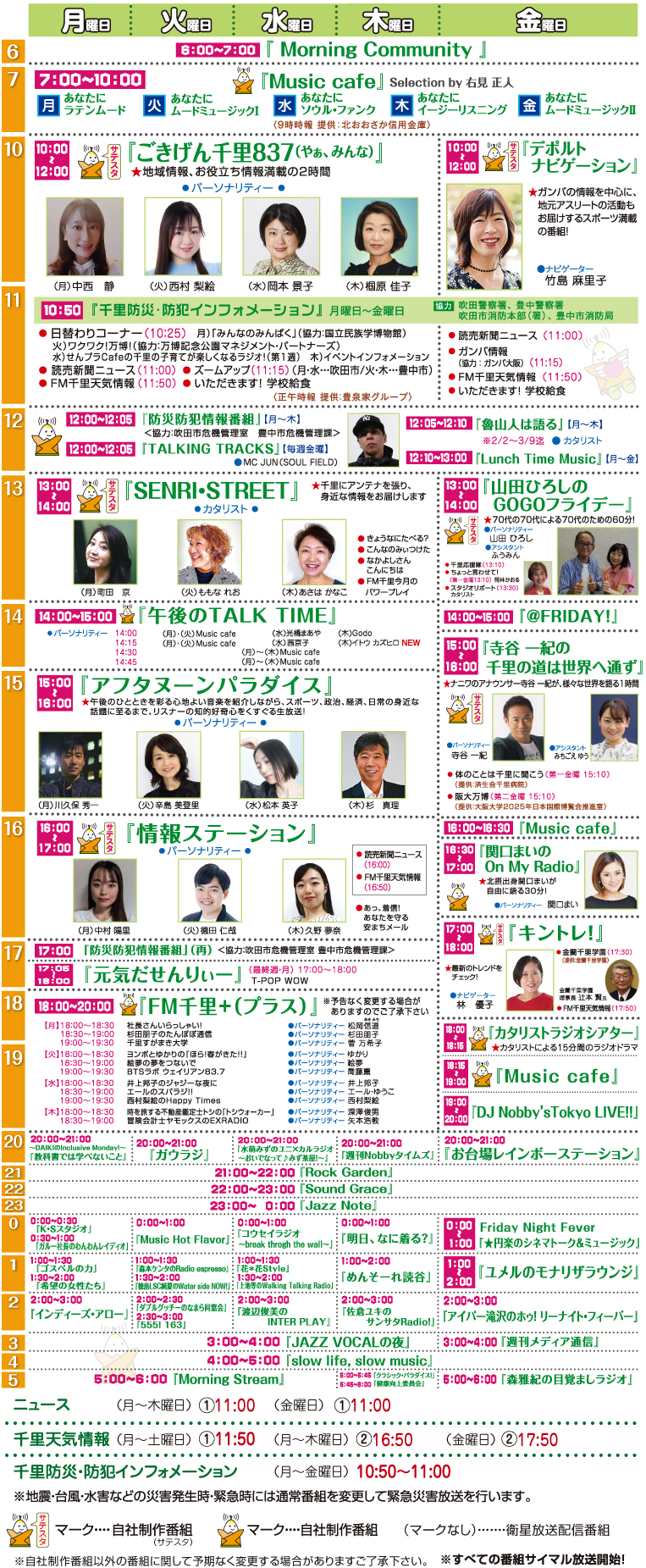 ※予告なく変更する場合がありますのでご了承下さい 自分の番組をFM千里+(プラス)から発信しませんか? お問い合わせはFM千里まで! 電話番号:06-6872-9111 E-mail :senri_plus@senri-fm.jp20:00-21:00